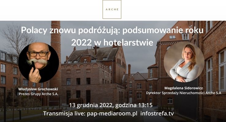 Wskaźniki przychodów są jednoznaczne. W 2022 roku, w przypadku hoteli Arche, wzrosły o 30 proc. w porównaniu z rokiem 2019. „Obserwujemy, że potrzeba bezpośredniego kontaktu z drugim człowiekiem i budowanie relacji stają się coraz bardziej istotne. Mieliśmy dużo konferencji oraz integracji firmowych” – mówi Władysław Grochowski, prezes Grupy Arche. Ponadto, po trudnych miesiącach pandemii, ludzie coraz częściej uciekają na wieś, szukając zieleni i możliwości obcowania z przyrodą. Dominowały wyjazdy okołoweekendowe do lokalizacji podmiejskich: Łochowa, Żnina, Janowa Podlaskiego. Ale nie tylko. „Rekordowe obłożenie notowały miejskie hotele warszawskie, z uwagi na odbywające się w stolicy wydarzenia biznesowe, konferencje, zjazdy, sympozja, szkolenia oraz kulturalne – m.in. koncerty. To był wyjątkowy rok pod tym względem” – ocenia Władysław Grochowski. Ważnym elementem działalności Grupy Arche w 2022 roku była pomoc uchodźcom z Ukrainy. „Z potrzeby serca i w naturalnym odruchu chęci niesienia pomocy bliźniemu w potrzebie, już pierwszego dnia wojny otworzyliśmy nasze 16 hoteli dla uchodźców z Ukrainy. Powołany sztab kryzysowy rozlokowywał rodziny, starszych, dzieci z domów dziecka, organizowaliśmy transporty. Do dzisiaj około 2,5 tys. ludzi przebywa w naszych obiektach i Fundacja Leny Grochowskiej przysposabia ich do życia w Polsce” – opowiada prezes Grupy Arche. W marcu 2022 roku Grupa Arche opatentowała również System Arche®. „Jako jedyni na rynku dzielimy się co miesiąc z inwestorami całym zyskiem wypracowanym przez hotel i oferowane w nim usługi: noclegi, szkolenia, gastronomię itp. Stanowimy rodzinę Arche, której zależy na tym, żeby właściciel pokoju hotelowego zarabiał nawet 17 proc. zysku od ceny zakupu lokalu, jak to ma miejsce w ostatnich miesiącach” – zaznacza prezes Grochowski. Firma pracuje obecnie nad nowym systemem inwestowania, który pozwoli czerpać zyski z inwestycji o mniejszym kalibrze niż zakup całego hotelowego apartamentu. Polacy znowu podróżują: podsumowanie roku 2022 w hotelarstwie – webinar, już 13 grudnia o 13.00. Transmisja: https://pap-mediaroom.pl Źródło informacji: PAP MediaRoom Wiadomość pochodzi z serwisu: pap-mediaroom.pl